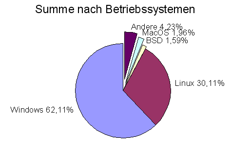 Summiert man die Betriebssysteme, zeigt sich, dass Windows als Betriebssystem vorherrscht. Der Windowsanteil ist in den zusammengefassten Umfrageergebnissen um ca. 8 Prozent höher. Neue Anwender arbeiten anscheinend eher mit Windows. Die geringe Anzahl von Macintosh Systemen dürfte an einer fehlenden deutschen Version für MacOS liegen.