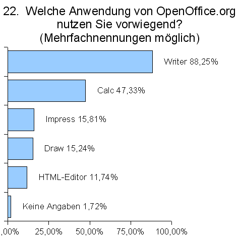 Die meistgenutzte Anwendung des Officepaketes ist die Textverarbeitung Writer. Ca. 50% der Nutzer geben an, die Tabellenkalkulation Calc häufig einzusetzen. Die anderen Bestandteile von OpenOffice.org werden mit 10% - 15% deutlich weniger genutzt. Interessant ist, dass neue Anwender sich eher mit Draw (15,24%) und dem HTML-Editor (11,74%) befassen als langjährige Nutzer (12,87% bzw. 7,38%).